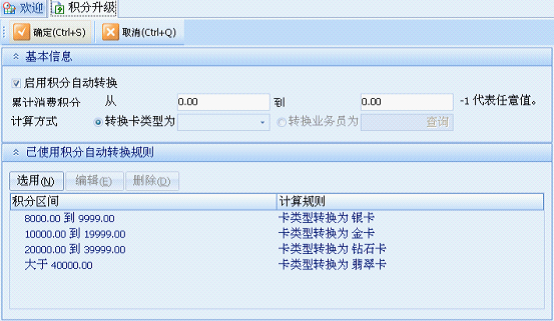 将积分区间设置好之后,当会员累计消费积分达到8000-9999之间时,系统自动将卡类型转换为银卡;当会员累计消费积分达到10000-19999之间时,系统自动将卡类型转换为金卡;当会员累计消费积分达到20000-39999之间时,系统自动将卡类型转换为钻石卡;当会员累计消费积分大于40000时,系统自动将卡类型转换为翡翠卡。