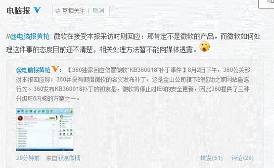 该事件经媒体披露后在微博上引起轩然大波,网友纷纷指责360私自发布形如“KB360018”的假补丁是“假传圣旨”,实则强制安装自家浏览器产品。而据国外权威技术网站systemexplorer发布的公告显示,KB360018的数字签名为360公司,该文件确为360浏览器升级安装包。