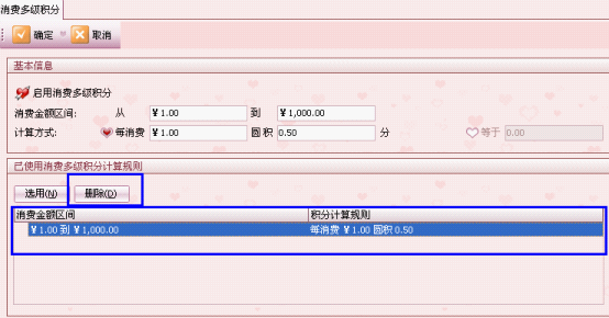 第二步:如需重新设置消费金额区间或积分额,选中设置的内容,点击“删除”即可重新设置。如下图: