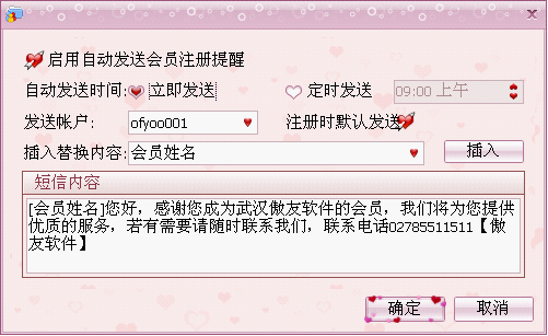 一般的会员通知短信,比如:会员注册、会员消费、储值,会员生日祝福等短信可通知行业短信通道发送短信,这类短信在软件里面短信助手设置模块里面设置完了之后,当有会员注册、会员消费这些操作后,系统会向会员手机自动发送短信,下面以“自动会员注册提醒”为例: