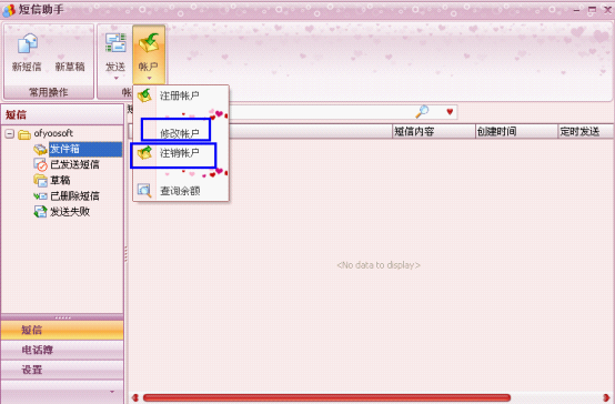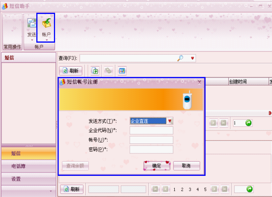 第一步:点击常用功能-短信助手,进入短信助手功能界面,点击“账户”,注册一个新的账户,出现如下图提示:(按所提供的帐号信息完成注册)