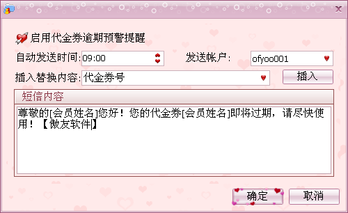 勾选启用代金券逾期预警选项后,当给客户发放代金券即将过期还未消费时,系统会自动给会员发送一条提醒短信。