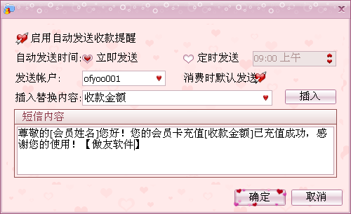 以上各项设置填写完成后,点击确定,即保存此项,在会员注册成功后,系统为自动为会员发送一条短信。
