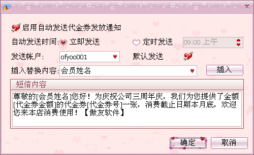 勾选启用自动发送代金券发放通知选项后,当公司做活动给客户发放代金券时,系统会自动给会员发送一条提醒短信。