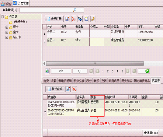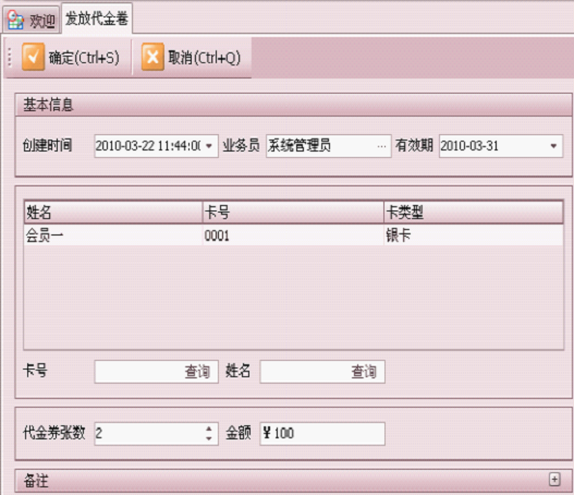 第一步:在营销管理-发放代金券 这里主要就是给会员发放代金券号及面值,比如给会员0001 发放两张代金券,金额为100,有效期为3月31号