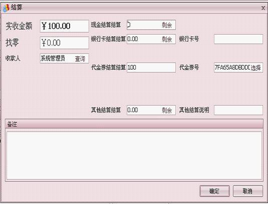 第三步:在常用功能-新消费结算时,可以用代金券来抵现,比如消费金额为:100元,可以直接用代金券来结算,结算后,代金券会相应的少一张。