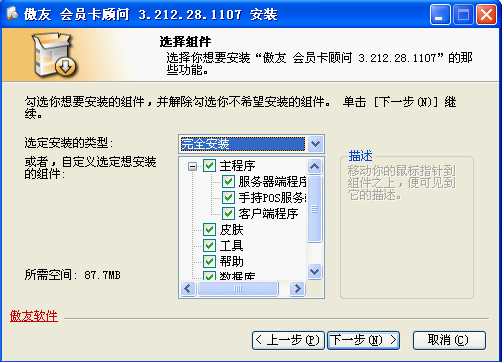 只需要一台电脑(单店)使用傲友软件,本机既为服务器端也为客户端,则选 [完全安装],必须选择安装服务器端程序、客户端程序、数据库。