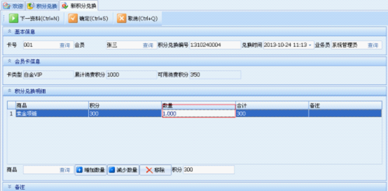 如果有会员来消费,想用积分兑换商品,直接在积分兑换的窗口里面选择商品,输入商品数量就可以了,操作起来更简单