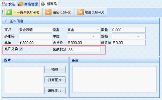 选用之后,在商品信息里面自动生成,我们可以看到素金项链兑换积分为300: