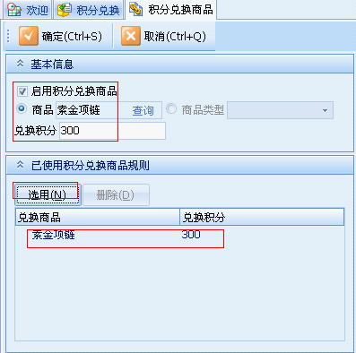 启用积分兑换商品的功能,然后选取商品或者商品类型,输入兑换该商品或者该类商品需要的积分数,例:素金项链,兑换积分300,