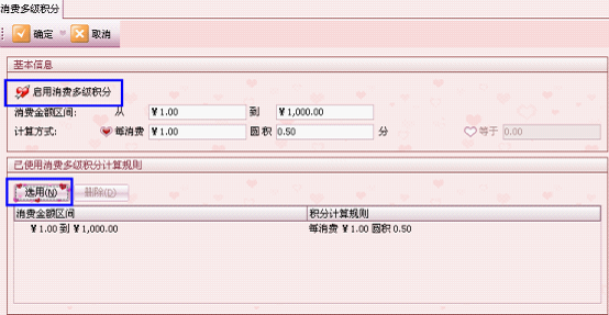第一步:启用该积分计算,录入某一消费金额区间,可获得不同的积分系数,点击“选用”, 则积分计算规则系统自动显示出来。如下图: