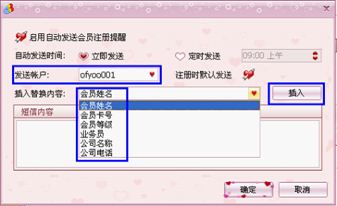 插入替换内容:可以将会员的姓名、会员卡号等信息插入到待发送内容里,见下图: