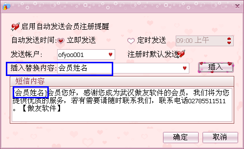 这里插入了会员的姓名,当会员注册成功会,会收到一条短信:XXX会员您好,感谢您成为武汉傲友软件的会员,我们将为您提供优质的服务,若有需要请随时联系我们,联系电话02785511511。