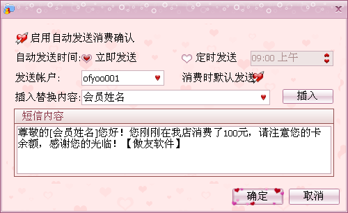 以上各项设置填写完成后,点击确定,即保存此项,在会员注册成功后,系统为自动为会员发送一条短信。