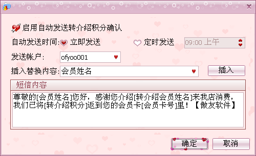 勾选启用自动转介绍积分提醒选项后,当会员介绍其他客户来店消费时,系统会自动给会员发送一条返积分的提醒短信。【此功能仅对有转介绍积分功能的软件有效】