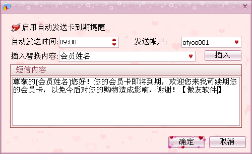 勾选启用自动发送卡到期提醒选项后,当会员的会员卡即将到期时,系统会自动给会员发送一条提醒短信。
