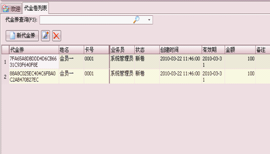 第一步:在营销管理-发放代金券 这里主要就是给会员发放代金券号及面值,比如给会员0001 发放两张代金券,金额为100,有效期为3月31号