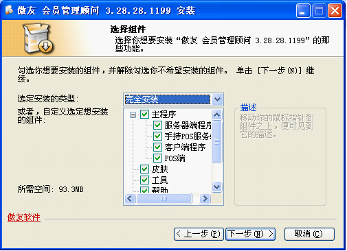 只需要一台电脑(单店)使用傲友软件,本机既为服务器端也为客户端,则选 [完全安装],必须选择安装服务器端程序、客户端程序、数据库。